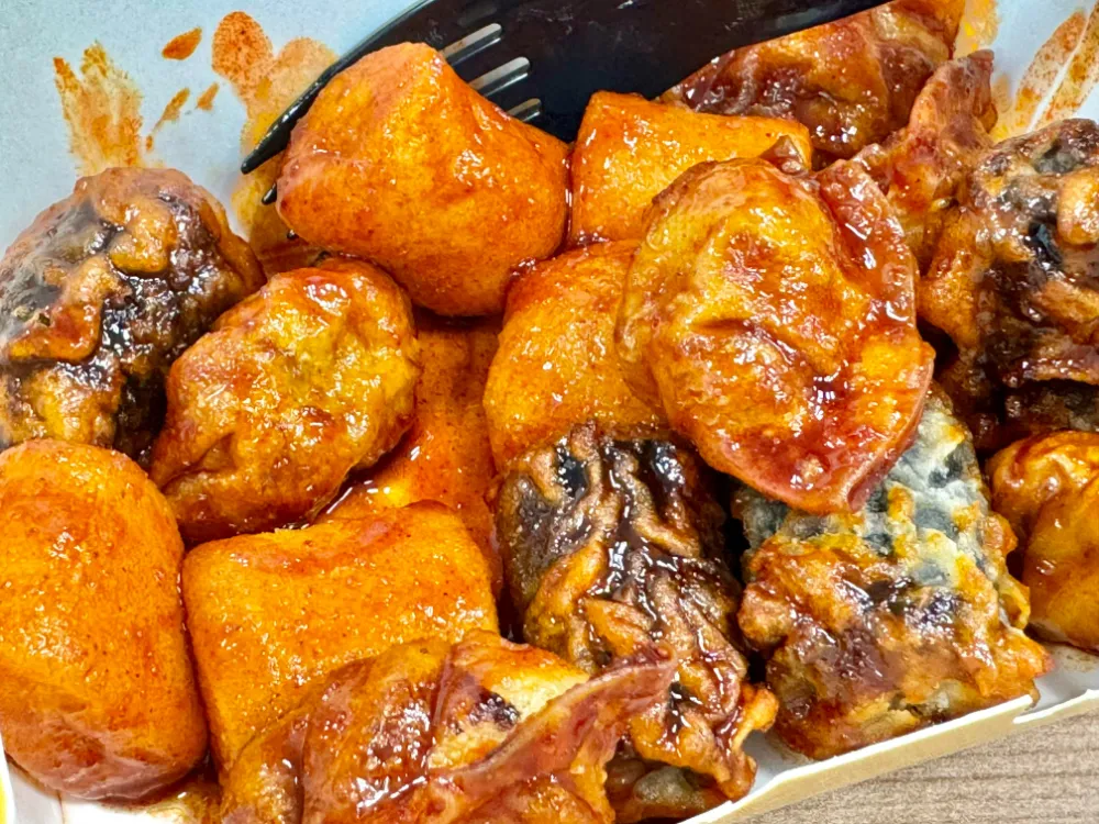 見た目は濃厚な赤いソースに包まれた春雨と餃子、そして餅。韓国屋台の雰囲気を感じさせる一皿です。箸で一口食べた瞬間、ブルダックソースの猛烈な辛さが襲ってきました。最初は甘辛系を想像していたのですが、これは完全に辛さ主役タイプ。味というよりは痛み。口の中が痛くて、春雨や餃子の味を感じ取る余裕もなく、ただ「つらい」。