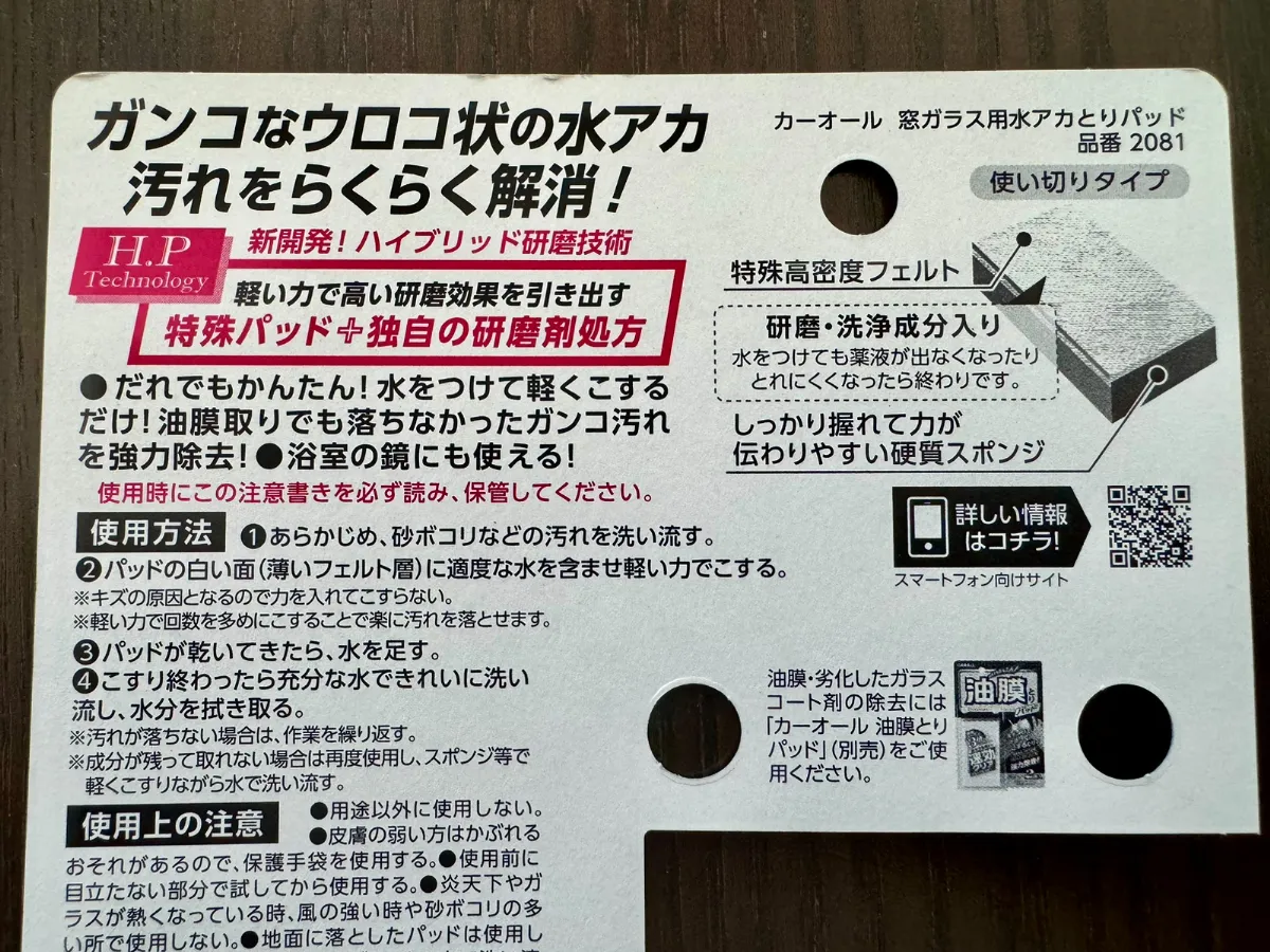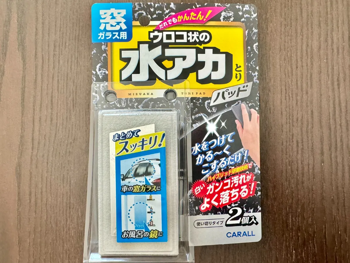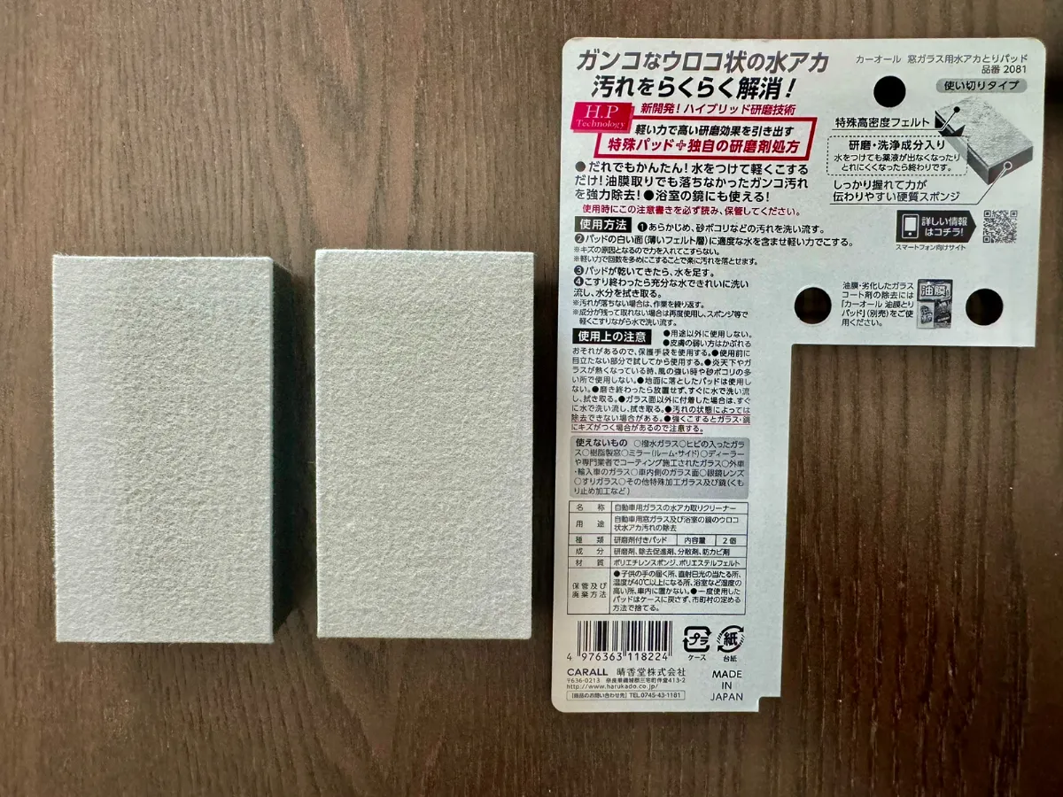 CARALLの水アカとりパッドは、低価格ながらしっかりとした研磨力を持つ優秀なクリーニングツールです。実際に使ってみると、力を入れずに時間をかけて擦り続けることで、ガラスのくすみやウロコ汚れが確実に落ちていきます。