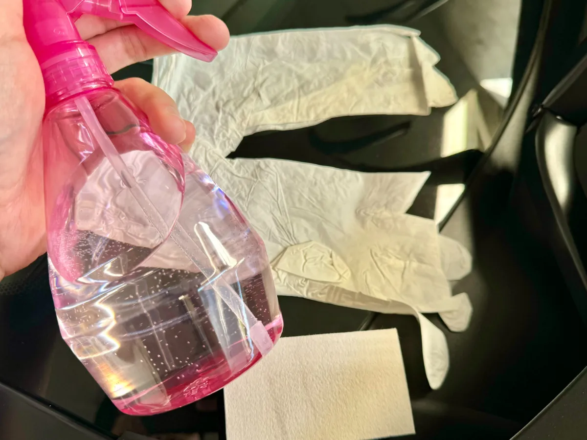 霧吹き、ゴム手袋、スポンジを用意して作業をしました。ゴム手袋はなくても作業ができます。霧吹きもゴム手袋もダイソーなどで売っています。