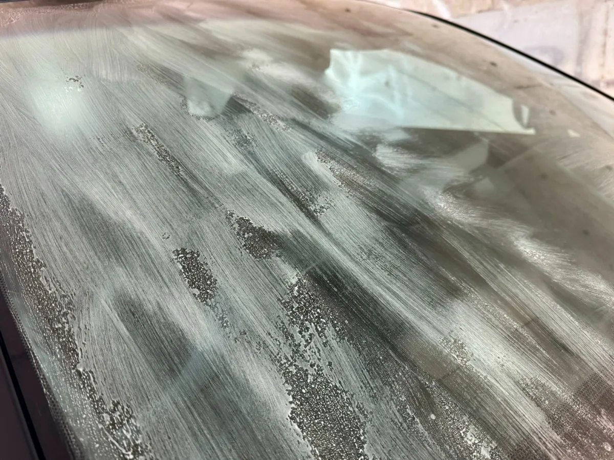 フロントガラスとリアガラスの合計2枚を作業し、かかった時間は約90分でした。長時間の作業でしたが、力をほとんど入れていないため、腕の疲労はほぼありません。特にガラス端の細かい部分は白く残りやすいですが、湿らせたファイバータオルで仕上げ拭きをすると綺麗に消えます。