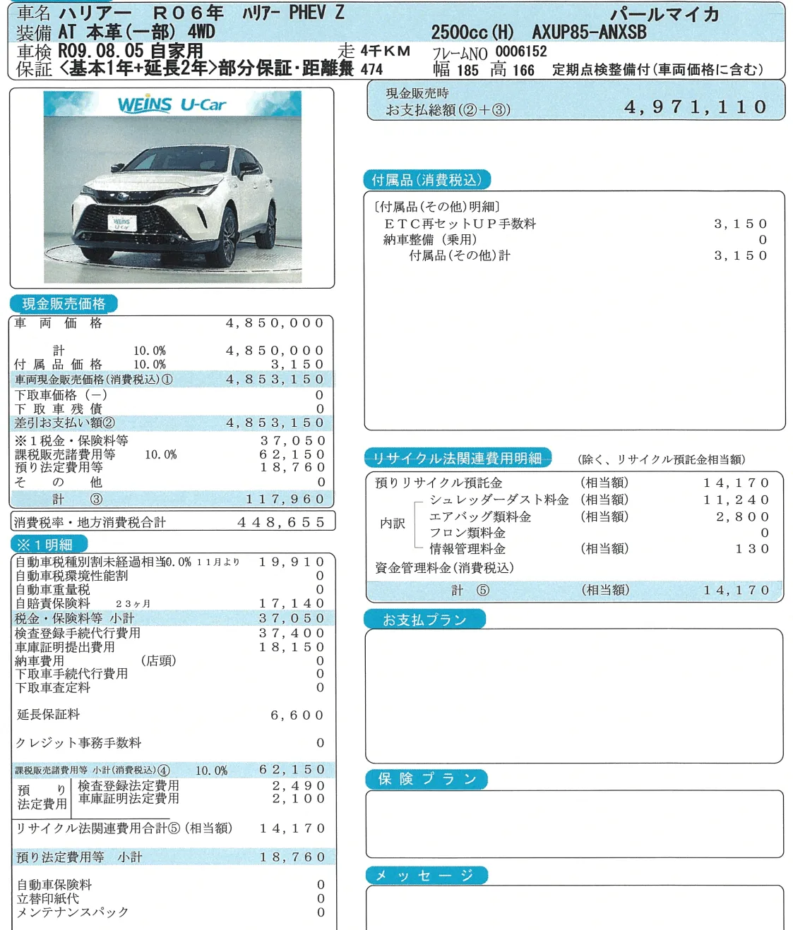 先日、ハリアーPHEV Z(中古車)の見積もりを取りました。