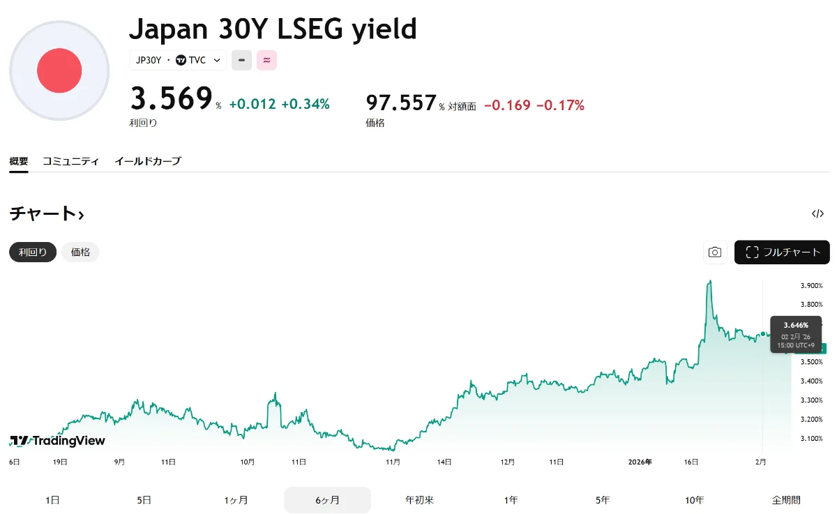 2026年2月上旬、日本国債30年の利回りは3.566で、直近の動きは前日比プラス0.017です。チャートの形は、長期的に右肩上がりの中で、1月途中で一度大きく跳ね上がり、その後も高い水準で推移しているように見えます。