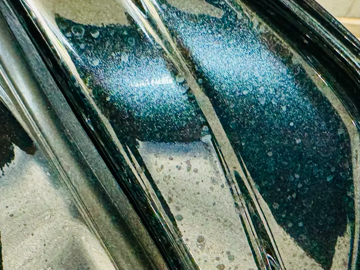 タオルで拭く程度ではびくともせず、お風呂の鏡に付く水垢と同じように、ミネラル成分を溶かす専用の溶剤が必要な状態でした。