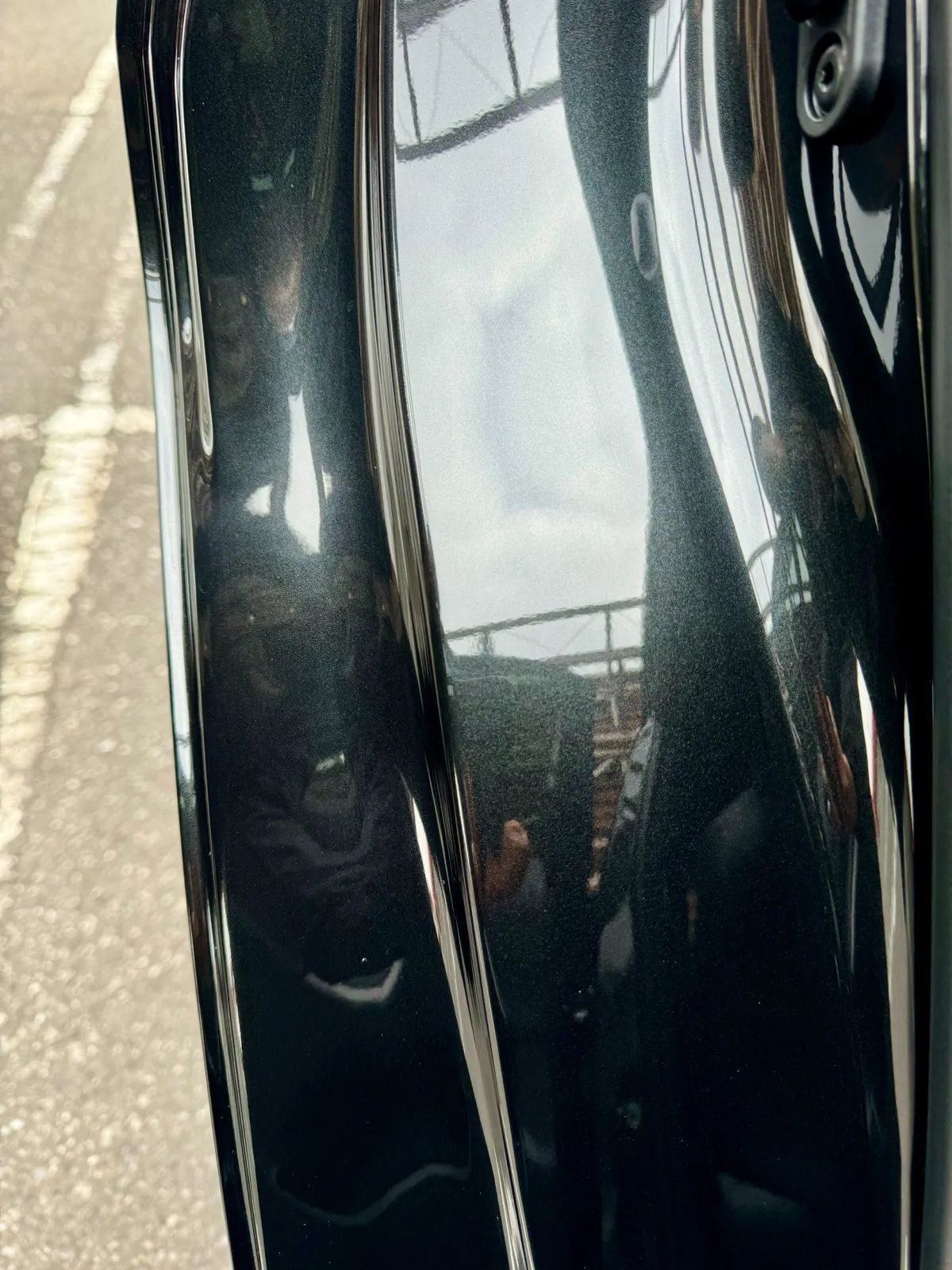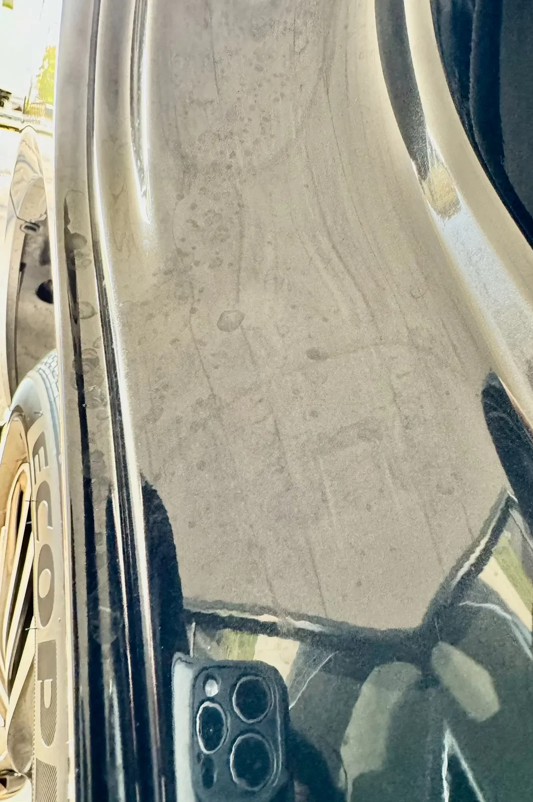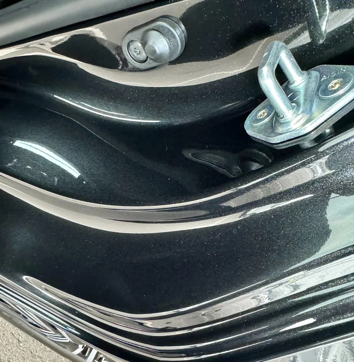 作業後は白く浮いていたウォータースポットが跡形もなく消え、黒いボディらしい深いツヤが戻りました。タオルで拭いても落ちなかった白い斑点がすべて消えたことで、ドアを開けたときの印象も大きく改善されました。