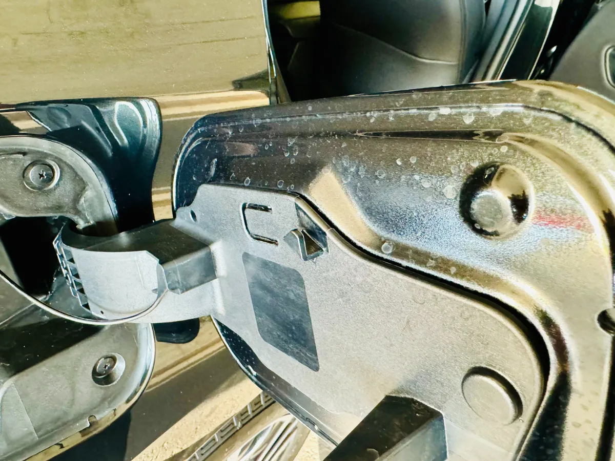 黒いボディは、一見きれいに見えてもドアを開けると白い水垢が線のように浮かび上がります。今回の車も例外ではなく、4枚のドアとリアハッチの裏側に目立つほど大量のウォータースポットが固着していました。