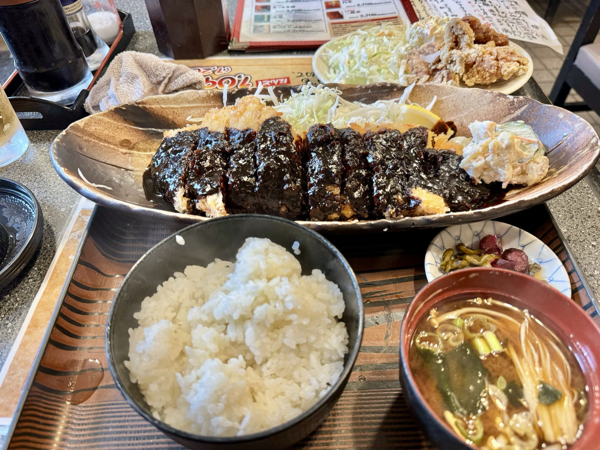 唐揚げも脇役に収まらない存在感だ。外はカリッと香ばしく、中は熱々でジューシー。味噌カツの濃厚さを邪魔せず、それでいて食欲を加速させる。店の雰囲気は昔ながらで落ち着いていて、肩肘張らずに食事を楽しめる。